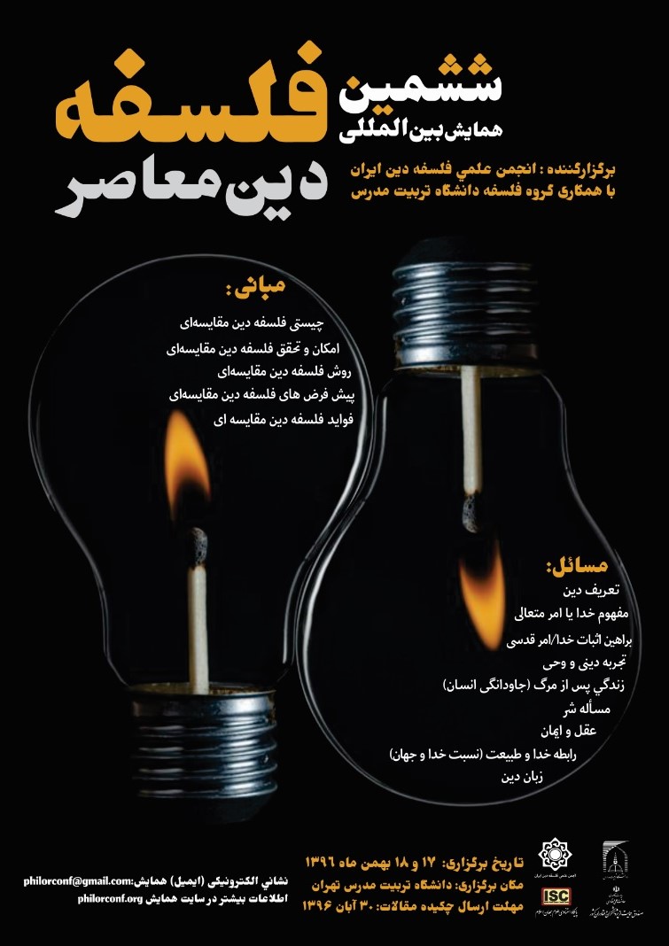 در ششمین کنفرانس بین المللی فلسفه دین معاصر «فلسفه دین مقایسه ای»، انجمن فلسفه دین ایران با مشارکت دانشگاه تربیت مدرس، تهران، 8-7 بهمن ماه 1396.